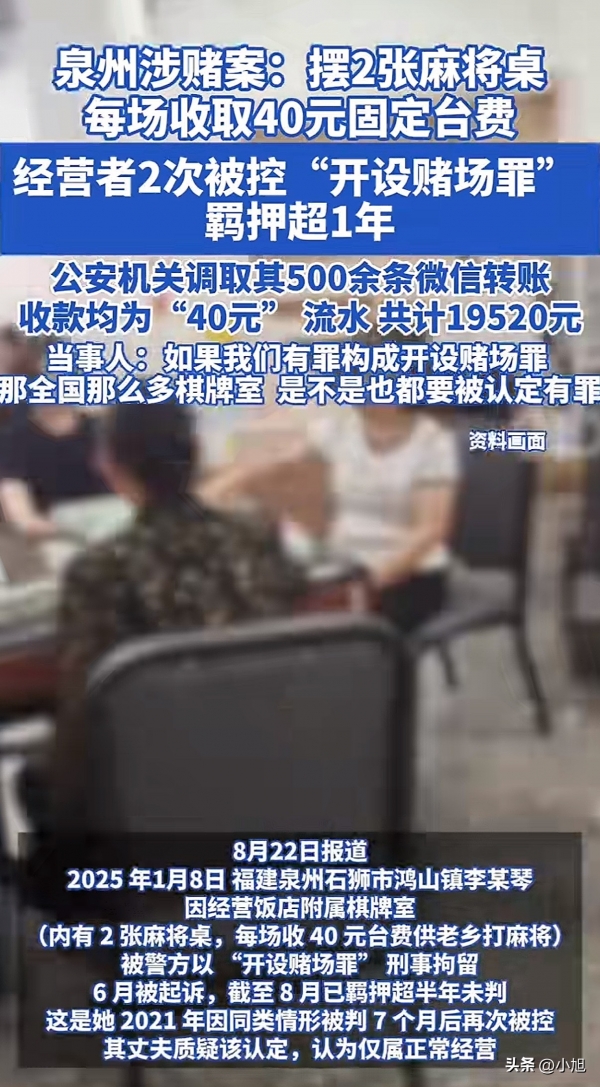 福建泉州一对夫妻在自家小饭店里摆了两张麻将桌,每场收40元台费,提供开水、空调和打扫服务。就这么个看似普通的经营行为,妻子李某琴却两次被警方以"开设赌场罪"刑事拘留,第一次判了7个月,第二次从2025年1月关到现在超过半年,还没判决。参赌的人罚500元就放了,但组织者被长期羁押,家属和律师怎么都想不通。