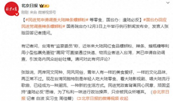 张晗说,两岸同文同种、同风同俗,青年人有一样的美食爱好、一样的文化品味,再正常不过。现在台湾同胞特别是年轻人吃大陆零食、看大陆影视剧、唱大陆流行歌曲,已经成为一种潮流、一种新的生活方式。民进党政客背离民心民意,顽固坚持"逢陆必反"思维,为了私利一味进行政治操弄,只会被民众所唾弃。