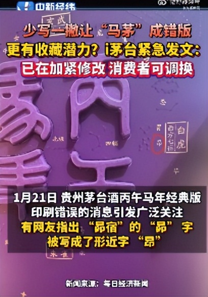 1月21日,"小茅i茅台"发文称,近日收到来信,指出53%vol 500ml贵州茅台酒(丙午马年)经典版的包装盒侧面上将二十八星宿中的"昴"写成了"昂",经第一时间查证,发现确实少了一"丿",由"昴"变成了"昂"。据悉,茅台公司已在第一时间联系供应链加班加点修改,并提醒已经提到货的消费者,如有意调换,可就近前往当地茅台自营店进行更换。