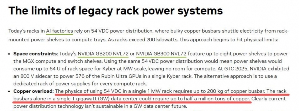 IT之家1月16日消息,据财联社 1 月 14 日报道,英伟达曾在 2025 年 5 月的一篇技术博客中谈到,传统架构中,单个一兆瓦机架需要重达 200 公斤的铜母线,单个一吉瓦的机架则需要高达 50 万吨的铜。