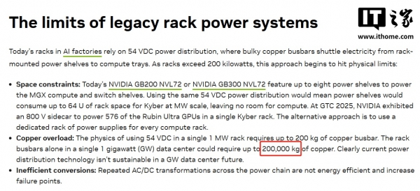 然而最新的调查发现,英伟达报告可能出现了一个非常低级的错误,导致铜缺口被过分高估。咨询公司 Thunder Said Energy 表示,一兆瓦的机架需要 200 公斤的铜,而一吉瓦相当于 1000 兆瓦,简单换算可知一吉瓦的机架应该需要 200 吨的铜母线,而不是论文中的 50 万吨。