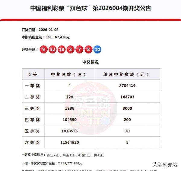 在2026年1月8号星期四晚,双色球游戏第26004期如期进行了开奖,目前双色球的奖池总资金为27.61亿余元,本期的总销售额为3.61亿余元,接下来我们就一起来看看本期的具体开奖情况吧!