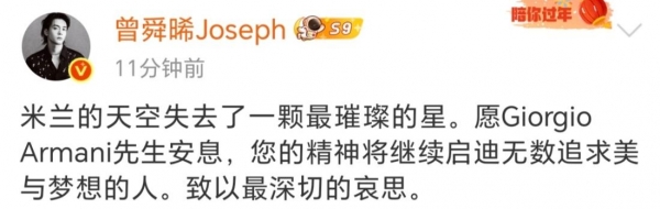 这次阿玛尼去世后,他在配文中表示: