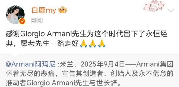 阿玛尼去世后,她也更新社媒,进行缅怀。