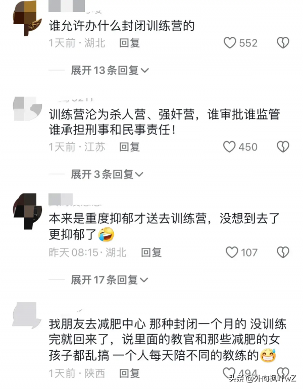 还有网友提出质疑:谁允许办这种训练营的?训练营沦为了杀人营、强奸营,谁审批谁监管谁承担刑事和民事责任!