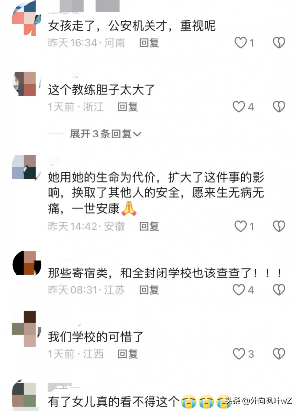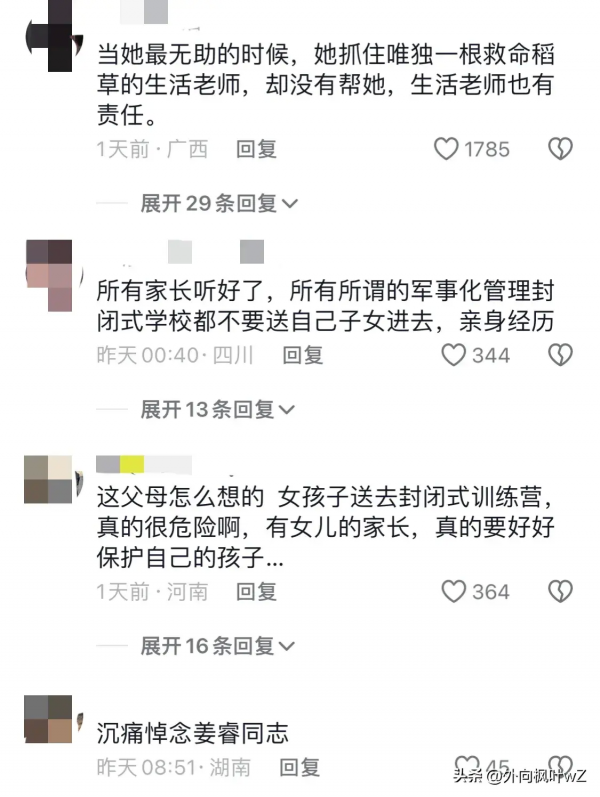 还有网友认为做父母的不应该给女孩子送去这种封闭式训练营,隐患太大。"这父母怎么想的,女孩子送去封闭式训练营,真的很危险啊,有女儿的家长,真的要好好保护自己的孩子。"