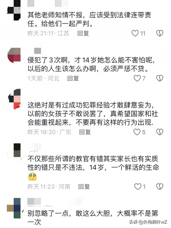 有网友为女孩儿感到痛惜:"侵犯了3次啊!才14会她怎么能不害怕呢,以后的人生可怎么办呢,必须严惩不贷。"可不曾想,14岁的孩子已经承受不住压力跳楼自杀了。