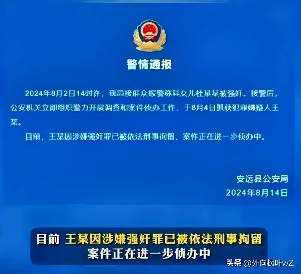 安远县公安局于8月14日发布了警情通报,称接到群众报警称其女儿被强奸后,接警之后,立即组织警力开展调查和案件侦办工作,于8月4日抓获犯罪嫌疑人王某,目前,王某因涉嫌强奸罪已被依法刑事拘留,案件也在进一步侦办中。