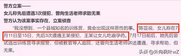 其实中间,孩子也向父母发出过类似求助的信号,想让父母过去看看自己,就谎称胃疼让家人送药,但父母当时并没有过度怀疑什么,训练营王某拒绝女儿接电话他们也没有产生怀疑只以为是训练营的规定,也没往其他方面想,可以想象到,女孩儿当时该有多绝望。