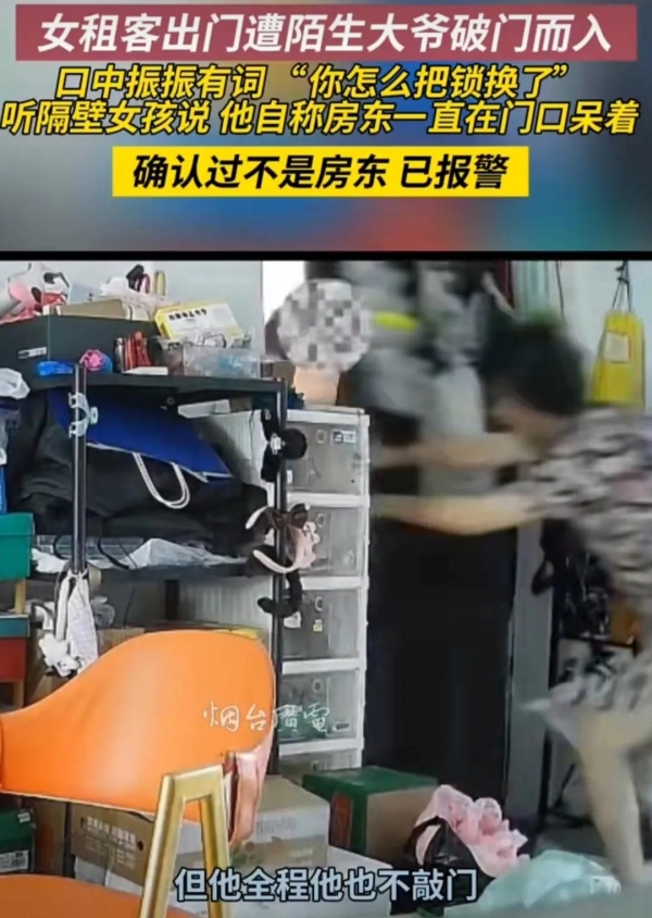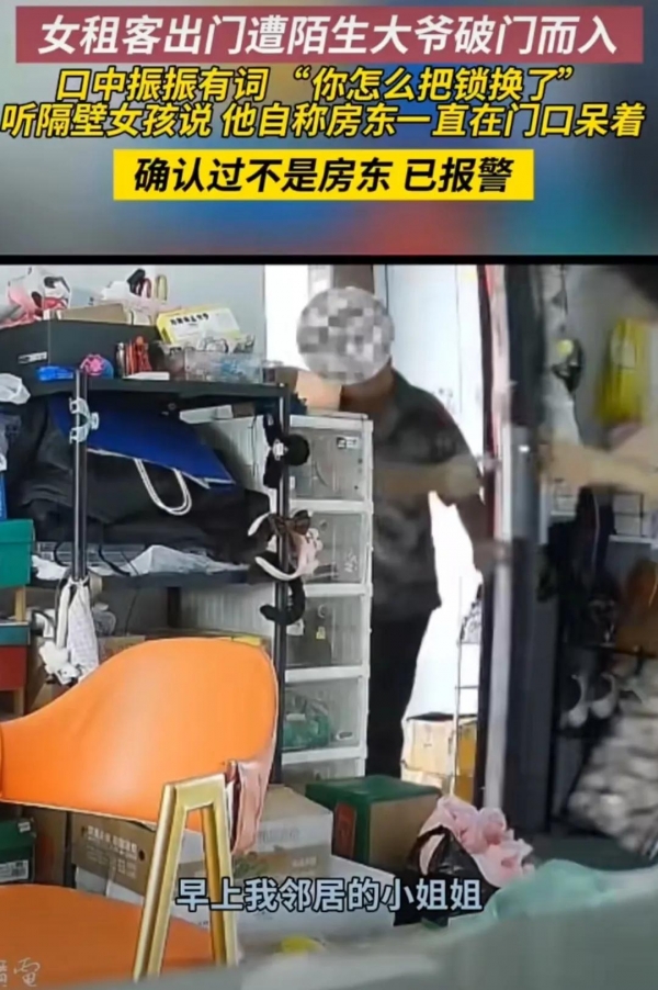 女租客打开门想要外出,遭到陌生大爷破门而入