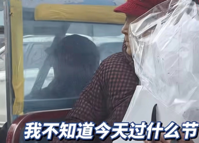 奶奶抱着鲜花坐在后座,笑得特别开心。面对路人的镜头,她有点心疼地说:"我也不知道今天过什么节,是老头子非要带我出来,花了百把多块钱……"