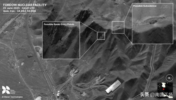 6月19日至20日,至少伊朗16辆卡车聚集在福尔多附近,可能是运机械设备,也可能是运走核心铀浓缩材料。