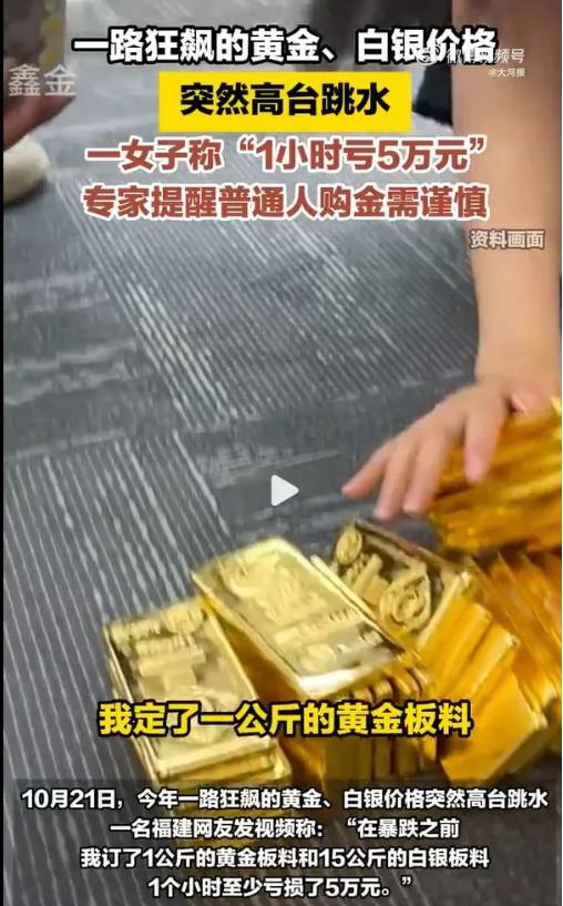 另据大河报,10月21日,今年一路狂飙的黄金、白银价格突然高台跳水。一名福建网友发视频称:"在下跌之前,我订了1公斤的黄金板料和15公斤的白银板料,1个小时至少亏损了5万元。"