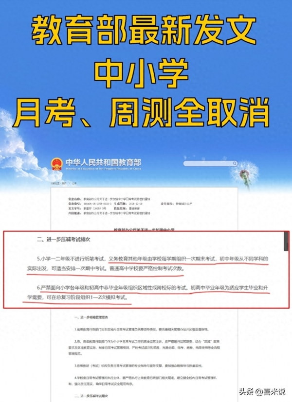 最近教育圈最受关注的事,莫过于教育部连发两道政策"硬规",直接给中小学过度考试"踩刹车"。这不是喊口号式的减负,而是出台了20条具体办法,从考试次数、命题要求到成绩公布,都划好了明确红线。家里有上学娃的、在学校教书的,还有关心教育的朋友,都得好好琢磨琢磨--这新规到底会影响谁?以后孩子学习咋衡量?今天就用最实在的大白话,把这事从头到尾说清楚,不玩虚的、不绕弯子。
