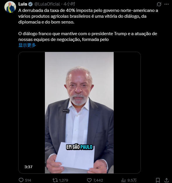 "这是朝着正确方向迈出的一步,但我们需要更进一步,"卢拉表示,"我们将以维护主权和巴西工人、农业和工业的利益为指导,继续与特朗普总统进行对话。"