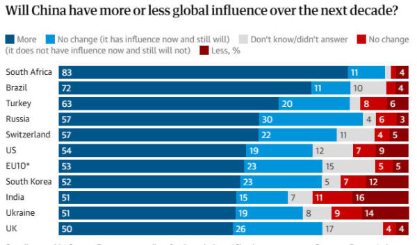 英国《卫报》1月14日称,这项调查由欧洲知名智库欧洲对外关系委员会(ECFR)与牛津大学合作进行。该调查在去年11月访问了来自21个国家的近2.6万名受访者后发现,几乎所有受调查地区的大多数人都预计中国在未来十年的全球影响力将增强。
