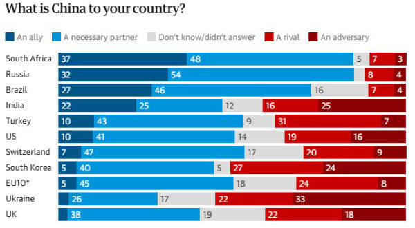 值得一提的是,许多人似乎并不担忧这一前景。民调显示,只有乌克兰和韩国的多数人将中国视为"对手或敌人",在其他地区,越来越多的人更视中国为"盟友"。在南非(85%)、俄罗斯(86%)和巴西(73%),大多数人视中国为"必要伙伴或盟友"。