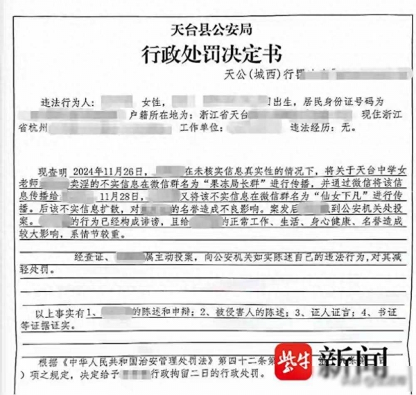 去年十二月,天台县公安局处理了这件事,他们认定林老师诽谤情节比较严重,对她作出行政拘留两天的处罚,孙某也被拘留了两天,钱某本来要拘留四天,但因为怀孕没有执行,林老师主动去投案,承认自己转发过消息,但她强调说,自己没有编造内容,只是听别人说了以后随手转发了,没想伤害谁。