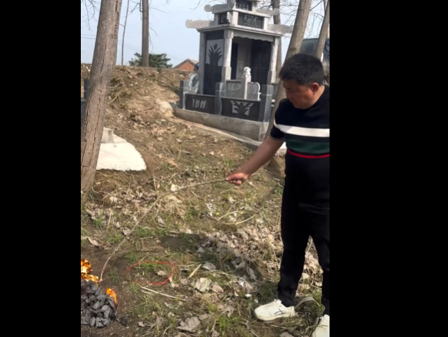 画面中,正是侄儿们在叔叔墓前祭扫的场景。在乡间的墓地里,纸钱的余火还在燃烧,一位侄儿手持树枝,在墓前认真打理着,神情肃穆而饱含深情。这座墓碑,是这位无儿无女的老人最后的归宿,而三个侄儿,成了他晚年最坚实的依靠,也成了他身后最长久的牵挂。