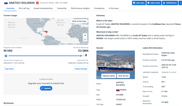 MarineTraffic网站显示,这艘名为Anatoly Kolodkin的油轮目的地是古巴。