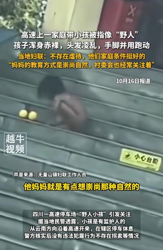 近日,网友拍摄到四川一高速上有家庭带着"野人小孩",这个孩子浑身赤裸、头发凌乱、手脚并用地跑动,视频引发热议。雅西高速民警回应媒体称,经核实,小孩身边有监护人,车是从云南方向开过来,暂未发现违法犯罪情况。