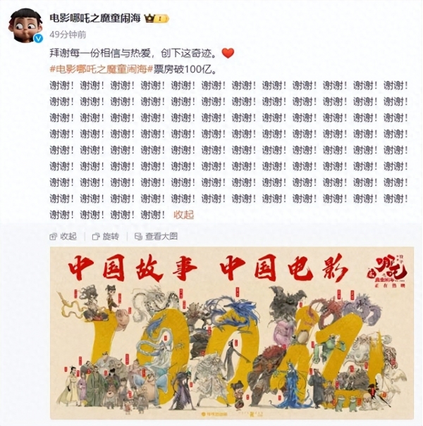 搜狐娱乐讯 2月14日,《哪吒之魔童闹海》官方晒出了中国风手绘的百亿海报,并连续写下了一百句"谢谢",拜谢观众的相信与热爱。