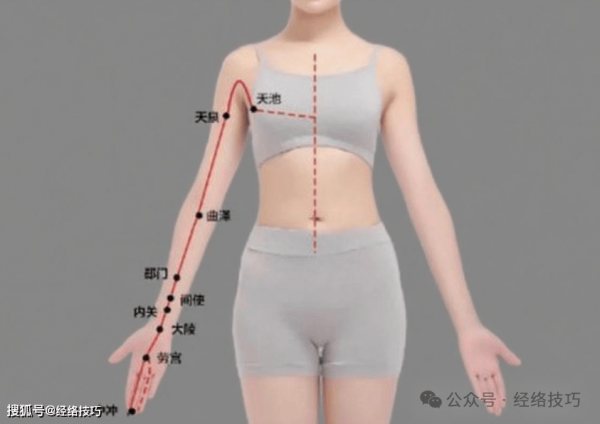 心包经起始于胸口,先经过腋窝这个地方,接着顺着手臂内侧的中间一直往中指尖方向延伸,在这条经络的路线上,有好几个气血运行比较关键的部位,像天池、及泉、内关、劳宫这些穴位就是,就拿内关穴来说吧,按揉它能够让胸腔变得更通畅,及泉在腋窝的顶端,是心气进出的一个重要通道,当我们做拉伸动作的时候,会带动这些区域,这样就能促使气血更好地流通。