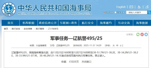 辽航警495/25,渤海海峡黄海北部,自11月23日16:00时至12月7日16:00时在38-51.7N121-38.2E、38-34.2N121-38.2E、38-33.9N121-07.9E、38-48.2N121-14.1E诸点连线范围内执行军事任务。禁止驶入。
