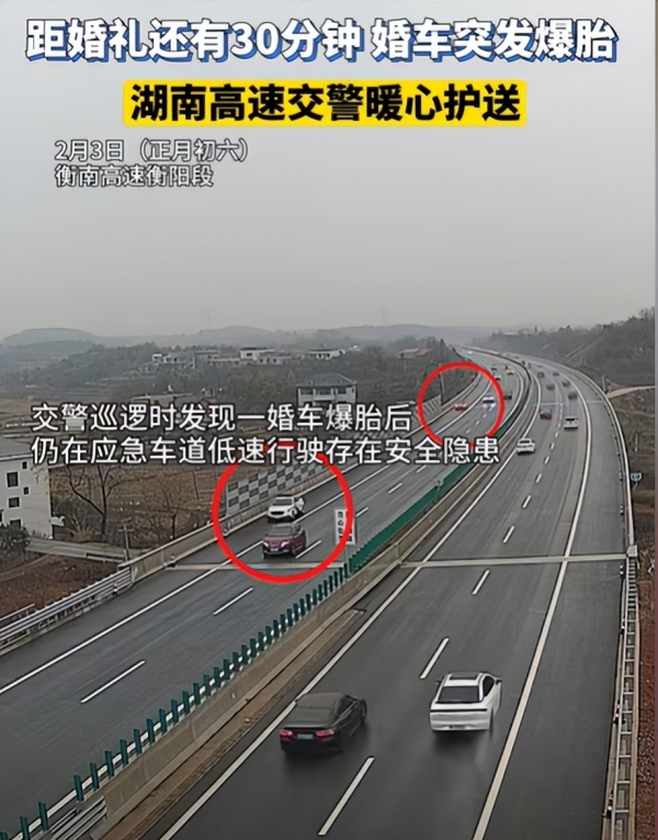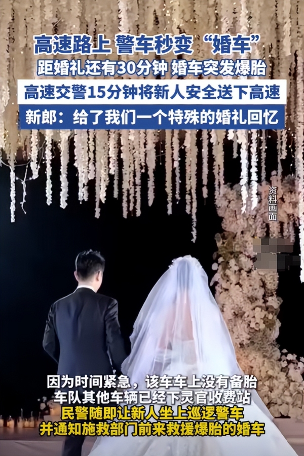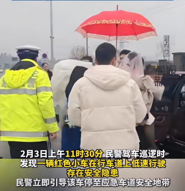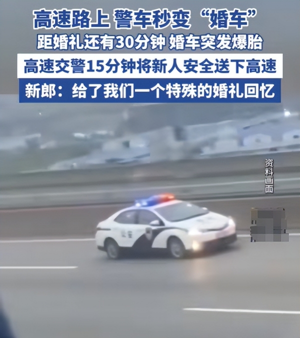 幸好,高速巡逻的交警及时发现了他们。考虑到爆胎车辆在高速上低速行驶太过危险,交警提议将婚车停在了就近的应急车道安全地带,警车临时充当婚车,护送新郎新娘,并通知施救部门来救援爆胎的婚车。
