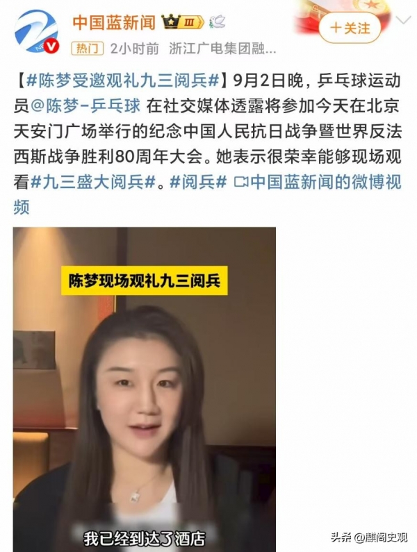 陈梦受邀参加纪念抗战胜利80周年的九三阅兵仪式,赛场上,她是饱受争议的"乒乓女王",观礼台上,她却是国家最高礼遇的座上宾。