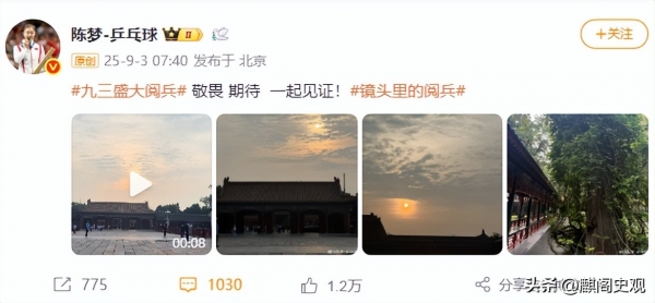 如今,31 岁的陈梦站在九三阅兵的观礼台上,虽没有了赛场上的激烈对抗,但她已然成为时代的一个标志性符号。