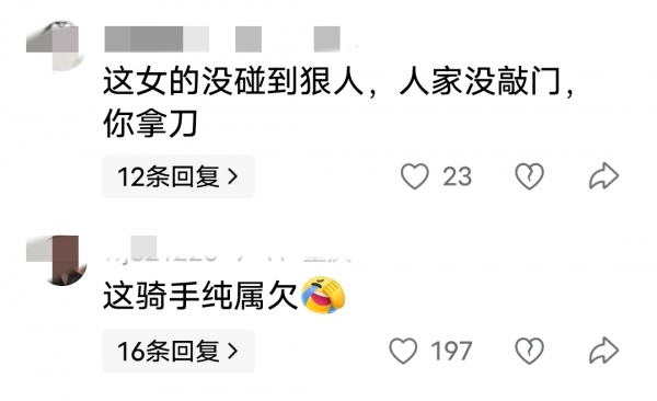 看完视频网友都炸锅了:有人力挺女孩,称"对待没素质的人就得用没素质的方法"。也有人后怕,"万一骑手也冲动,后果不堪设想"。