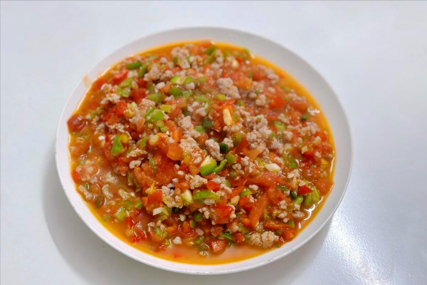 所需食材:番茄、蒜末、青辣椒、猪肉、植物油、盐、鸡粉