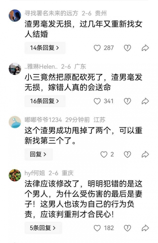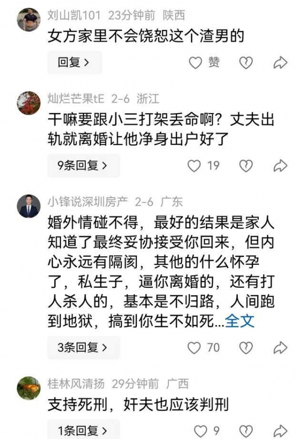 网友们的评论,字字句句都是怒火:"渣男成功甩掉了两个,是不是还要找第三个?""明明是他的错,为什么死的是无辜的原配,他却毫发无伤?""法律是不是该管管这种始作俑者?不能只靠道德谴责啊!" 还有人替丁某某感到不值,她当初要是狠下心来和程某离婚,是不是就不会有这场悲剧?
