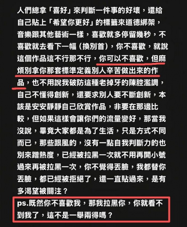 有人吐槽新专辑不好听,黄雨勋直接硬刚:你可以不喜欢,但麻烦别拿你那套标准定义别人辛苦做出来的作品。既然你不喜欢我,那我就拉黑你,这不就一举两得了吗?