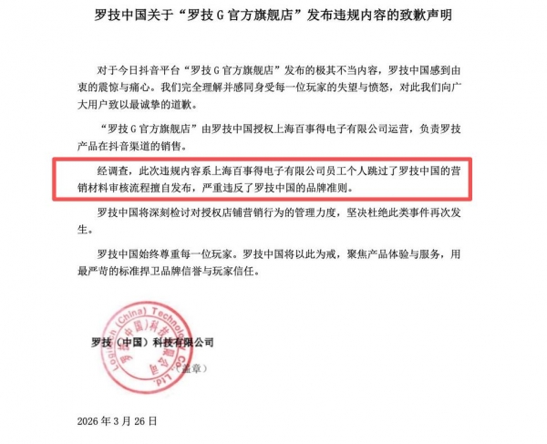 虽然罗技反应够快,短短几小时就删除视频,深夜发表道歉声明。但这个声明,多少有些许潦草,说是代运营公司员工擅自跳过审核发布。