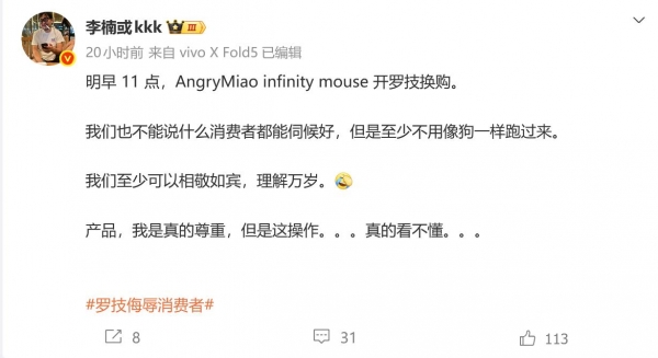 这不,魅族前高管李楠第一时间在微博上开蹭,明面上 cue 罗技,借机还给自个的 AngryMiao infinity mouse 产品宣传了一波。这营销速度,小雷给到夯。