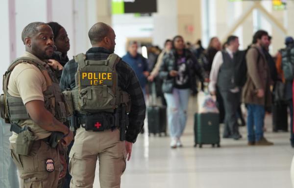 美国运输安全管理局代理局长麦克尼尔3月25日在国会众议院举行的听证会上表示,如果国土安全部"停摆"持续,机场安检大量空岗情况无法缓解,该局可能不得不考虑关闭美国部分机场,直至资金恢复。图为3月23日,移民与海关执法局的执法人员在美国纽约拉瓜迪亚机场的出发安检处执勤。 图源:新华社