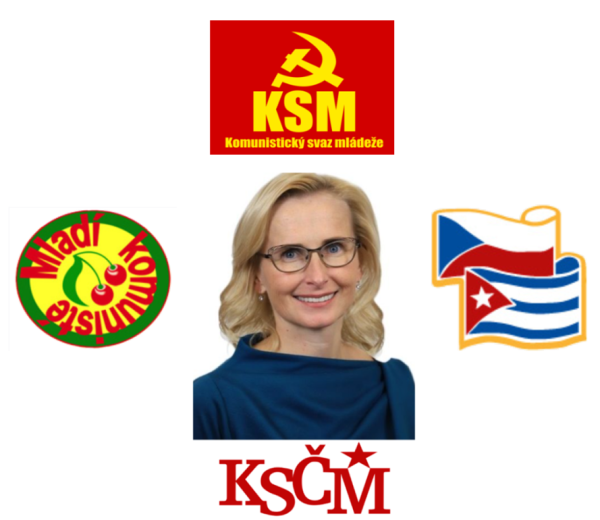 捷克共青团(捷摩共直属,左)、捷克共青团(半独立,上)、捷古人民友谊协会(右)、捷克摩拉维亚共产党(下)、捷共中央现任主席科内奇娜(欧洲议会议员,中)