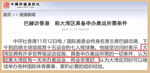 走访多地场馆的巴赫盛赞,大湾区具备申奥条件,愿意支持大湾区申奥,这可真不是随便说说的。