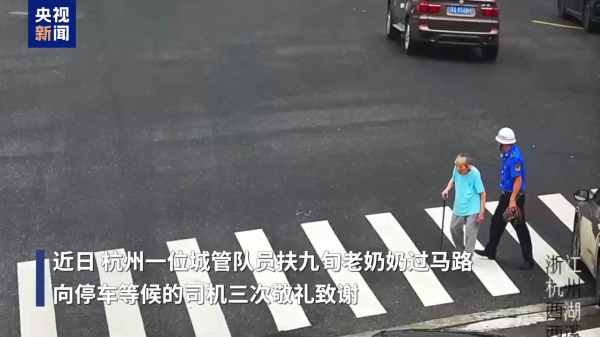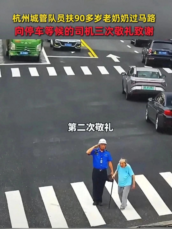近日,杭州一名城管队员搀扶老人过马路时,向礼让车辆连敬三次礼的视频在网上刷屏,网友纷纷点赞这场温暖的"双向奔赴"。