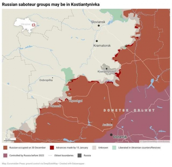 地图绘制专家普莱弗拉是首个披露俄军渗透部队现身康斯坦丁尼夫卡西郊别列斯托维伊区的消息人士。他在周二发文指出:"目前尚不清楚这些渗透部队是否已被乌军消灭,但他们出现在该区域的事实,无疑暴露了俄军在这一方向的作战企图。"