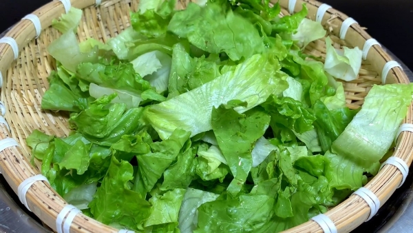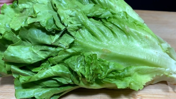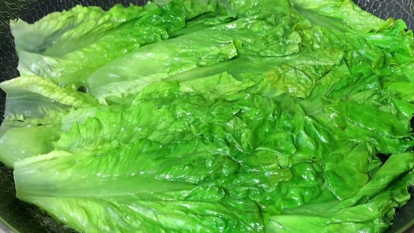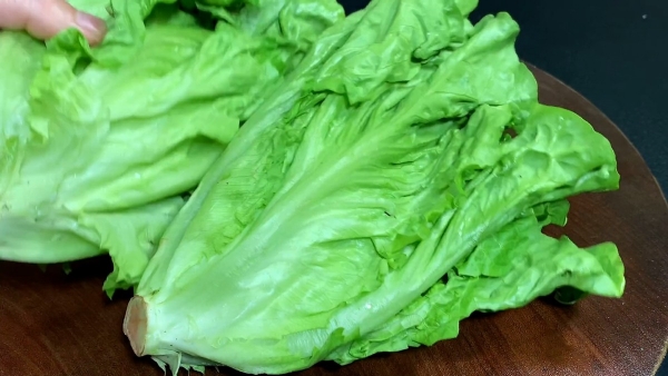 准备两颗生菜,把生菜根部切掉不要,把生菜一片一片打开,用流动的清水将生菜清洗一下,一片一片清洗干净,控水捞出来先放一旁备用。