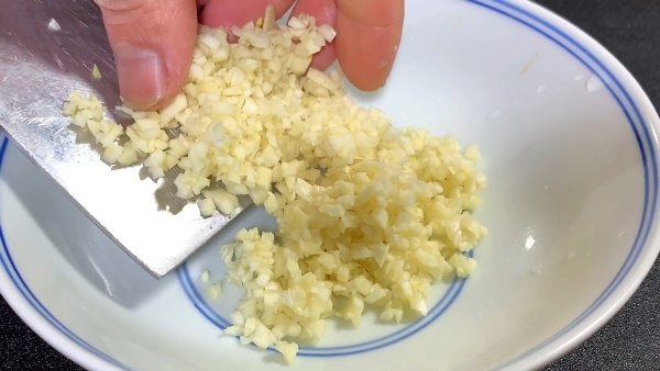 大蒜压碎,剁成蒜末,生姜切成薄片,改刀切成姜末,全部切好后加入碗中备用。
