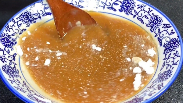 调个料汁,空碗加入蚝油,生抽,白糖,胡椒粉,玉米淀粉,倒满一小碗清水,用勺子搅拌均匀。