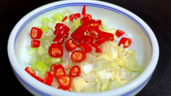 大蒜用刀拍碎,剁成蒜末,大葱切成葱花,小米椒切成小圈,切好后和蒜末放在一起。