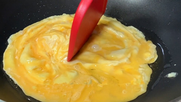 起锅加入少量食用油,油热把鸡蛋液放入锅中,把鸡蛋液开小火炒熟,把鸡蛋液炒制成块,炒好后装入碗中备用。