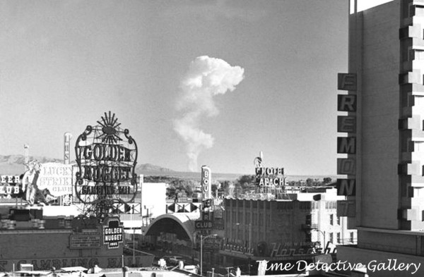 美国1950年代在内华达试验靶场进行核试验期间,附近的拉斯维加斯闹市区都可以看到核弹爆炸后腾起的蘑菇云 社交媒体
