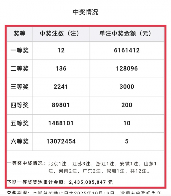 全国共中出12注一等奖!单注奖金高达6161412元!中奖福地分布在:北京(1注)、江苏(3注)、浙江(1注)、安徽(1注)、山东(1注)、河南(2注)、广东(2注)、深圳(1注)。