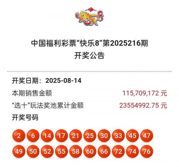 二、快乐8第2025216期:选十奖池2355万,号码已开